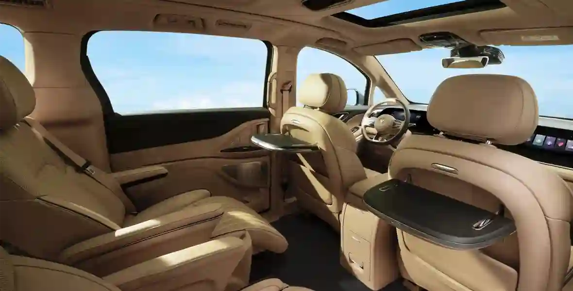 Просторный салон бизнес-класса с раздельными креслами второго ряда, оснащенными подогревом, вентиляцией, массажем, электрорегулировками и подставками для ног, превращает минивэн в настоящий офис на колесах, где можно спокойно поработать или отдохнуть в дороге. Сдвижные двери с электроприводом обеспечивают удобную посадку, а отдельная зона климат-контроля позволяет настроить температуру под себя.